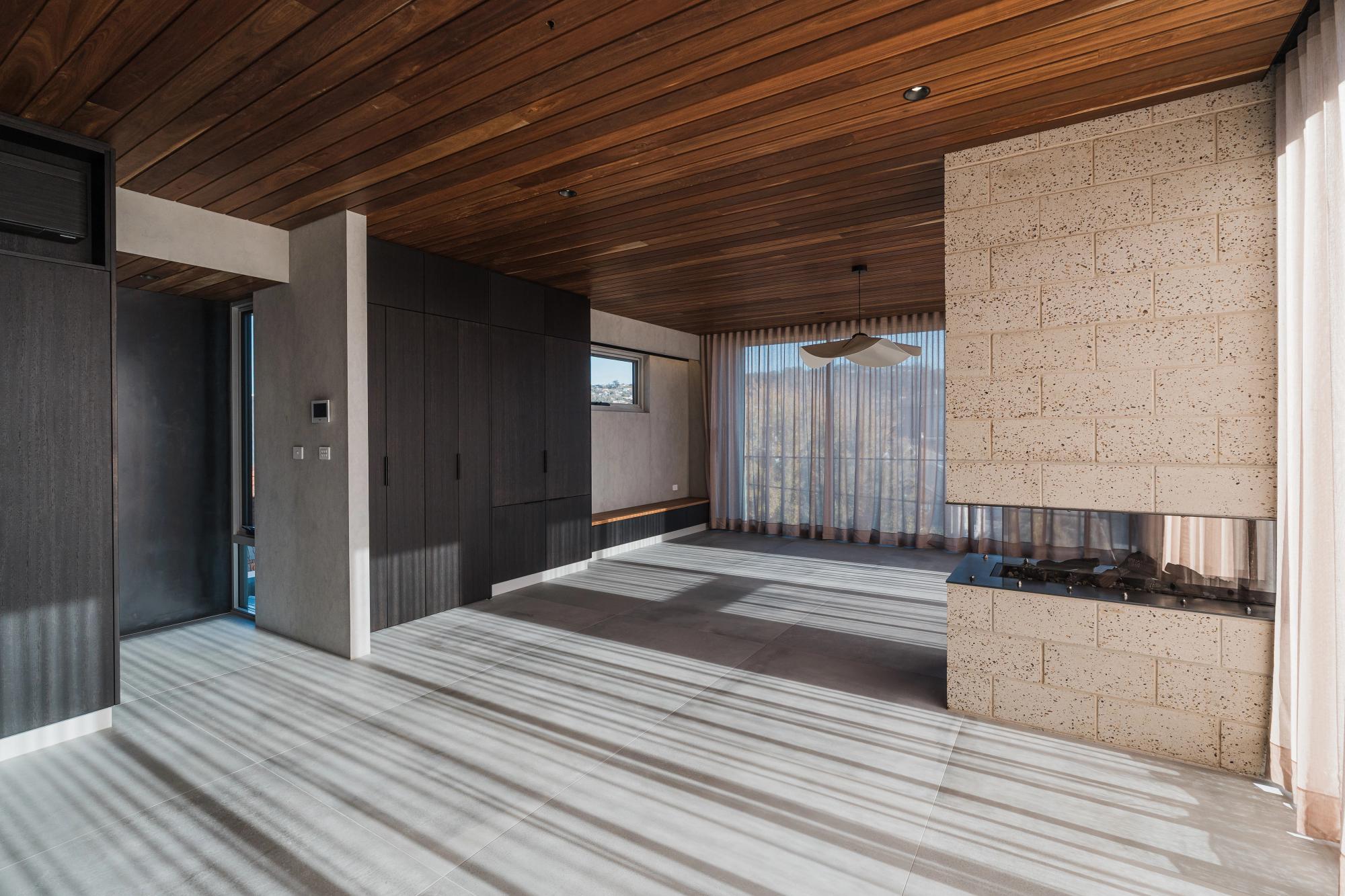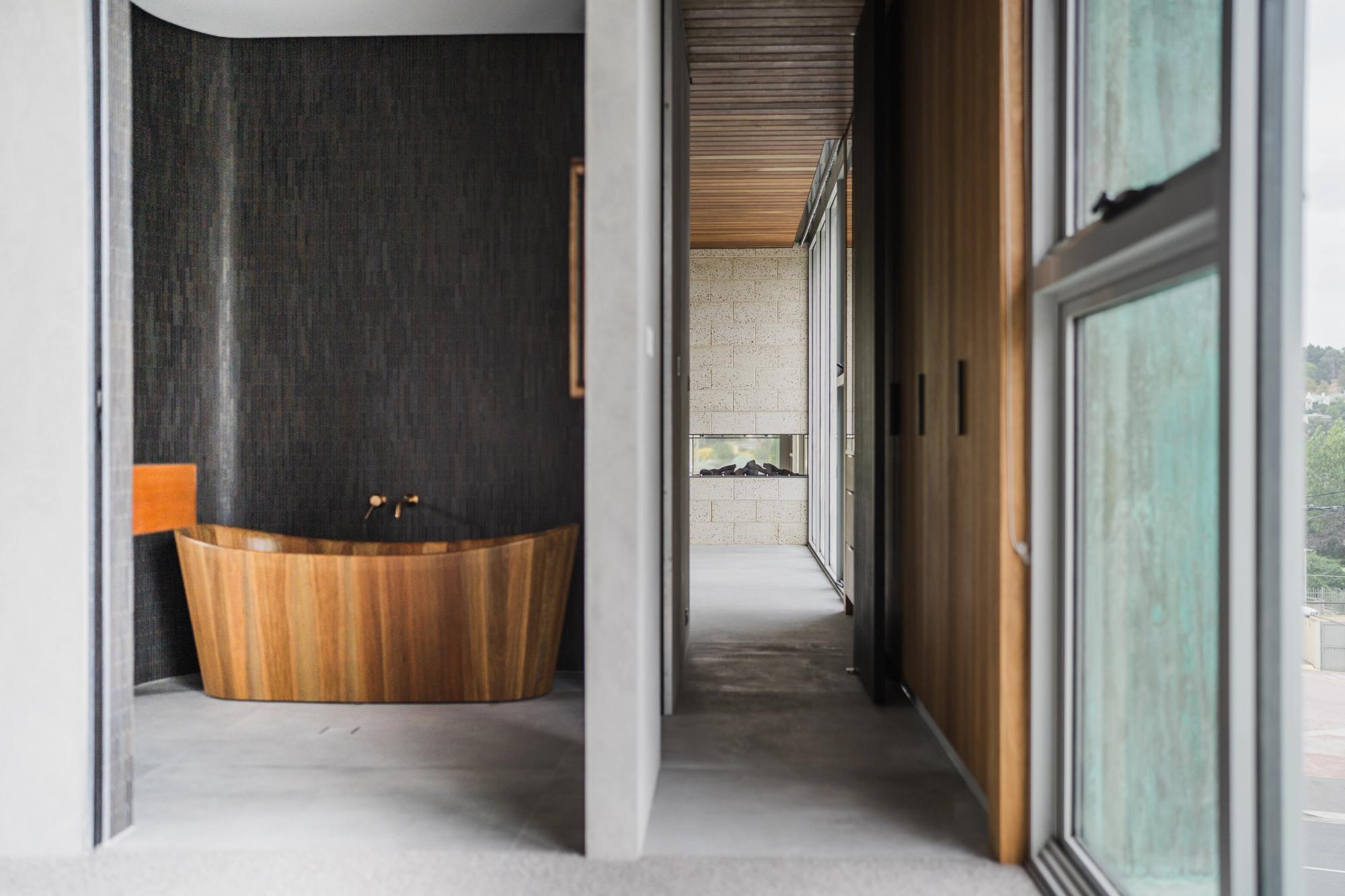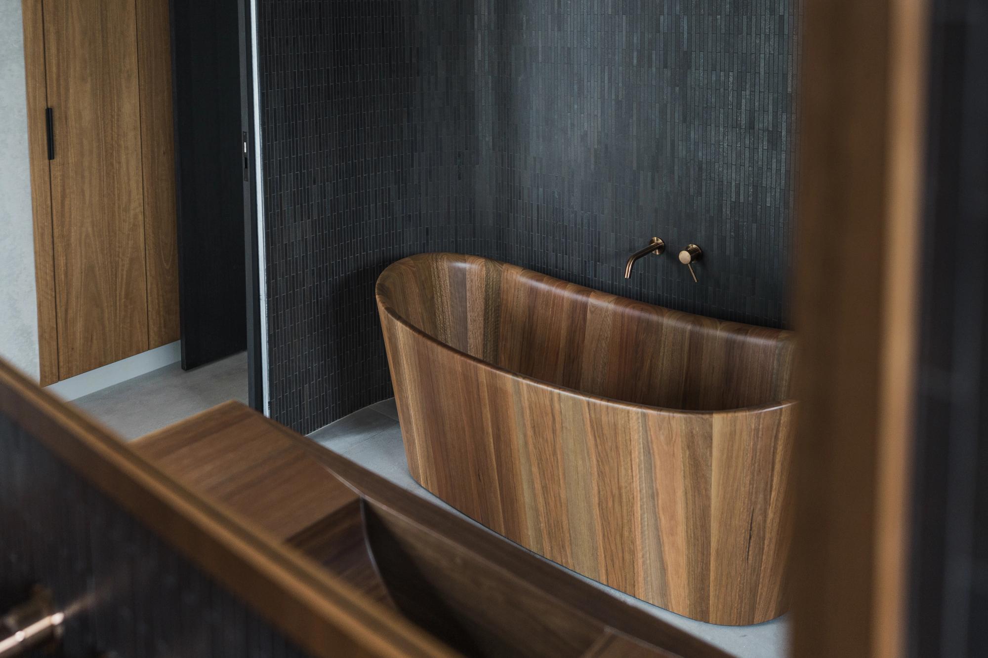 Inside, every element was considered, from the custom joinery to the layered textures and lighting. One standout feature is the handcrafted timber bath from Byron Bay, built to fit perfectly in the bathroom, making it as much a statement piece as it is a place to relax.