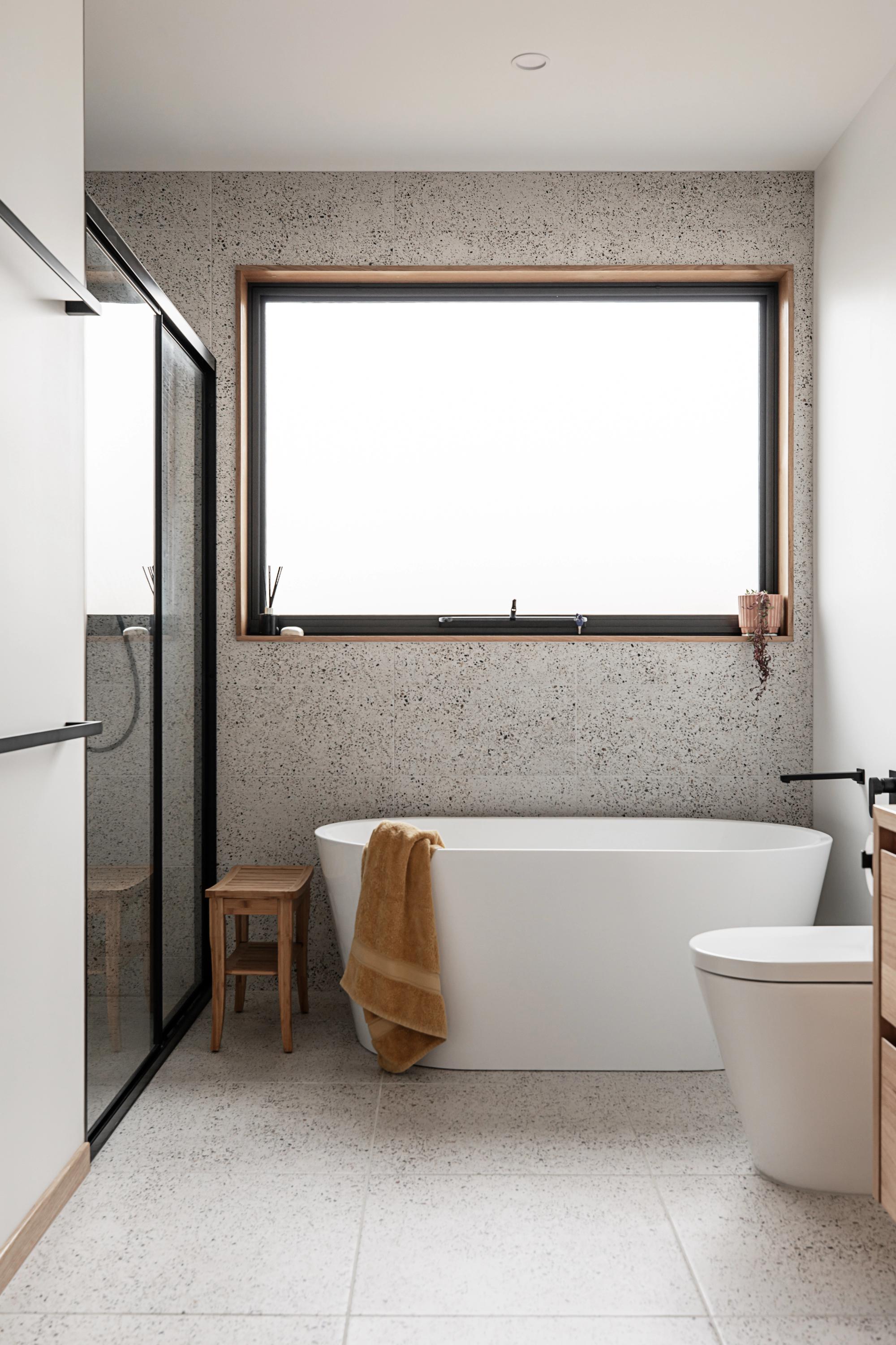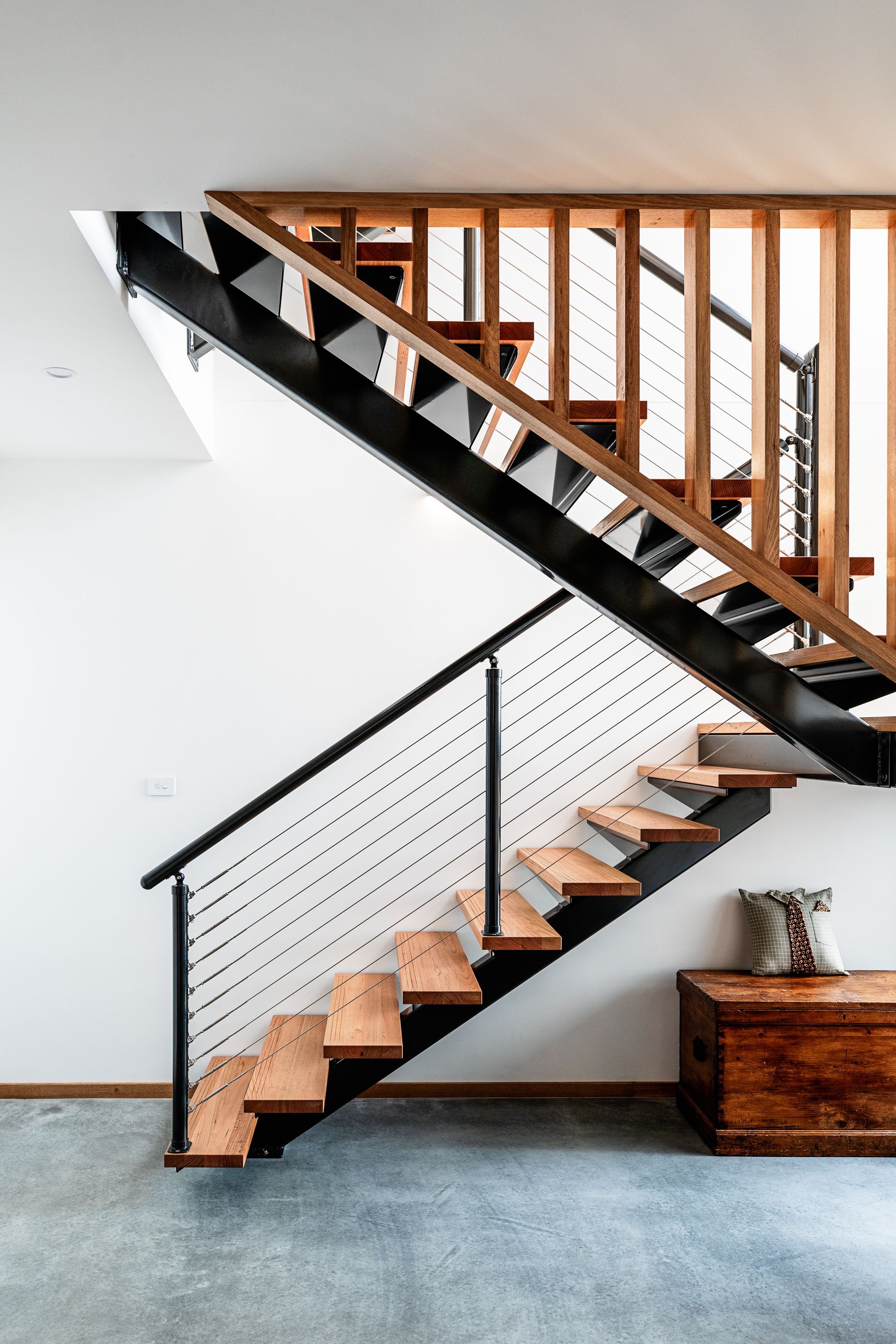 Inside, the staircase is an eye catcher. With beautiful timber treads, a sleek steel stringer, and huge window that frames the view perfectly.
